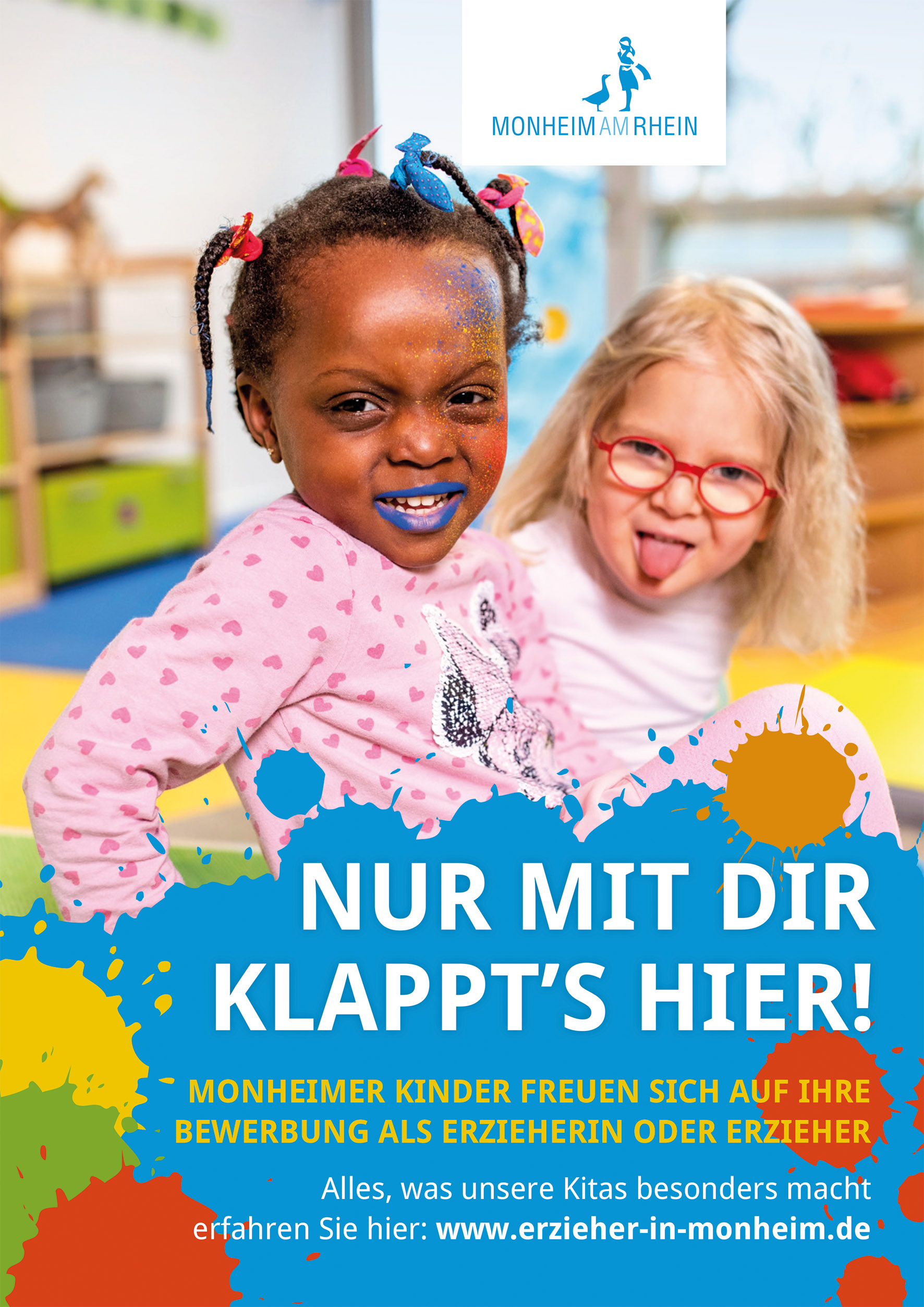 Um allen jungen Monheimerinnen und Monheimern einen bestmöglichen Start ins Leben zu ermöglichen, wurden allein im letzten Jahr auch wieder vier neue Kitas im Stadtgebiet eröffnet. Sechs weitere sind schon in Planung. Für den Erhalt dieser herausragenden Standards und den weiteren Ausbau sind die Stadt und alle weiteren Kita-Trägerinnen und Träger auf der ständigen Suche nach Verstärkung. Unter dem Motto „Nur mit Dir klappt’s hier!“ wurde jetzt eine gemeinsame Kampagne gestartet, zu der nicht nur in der Monheimer Kita Max und Moritz ein kleiner Film mit großem Augenzwinkern und unübersehbar riesigem Spaß entstanden ist, sondern echte Monheimer Kinder künftig auch auf Plakaten ihre klare Einladung zum Ausdruck bringen: Wir freuen uns auf Eure Bewerbungen!