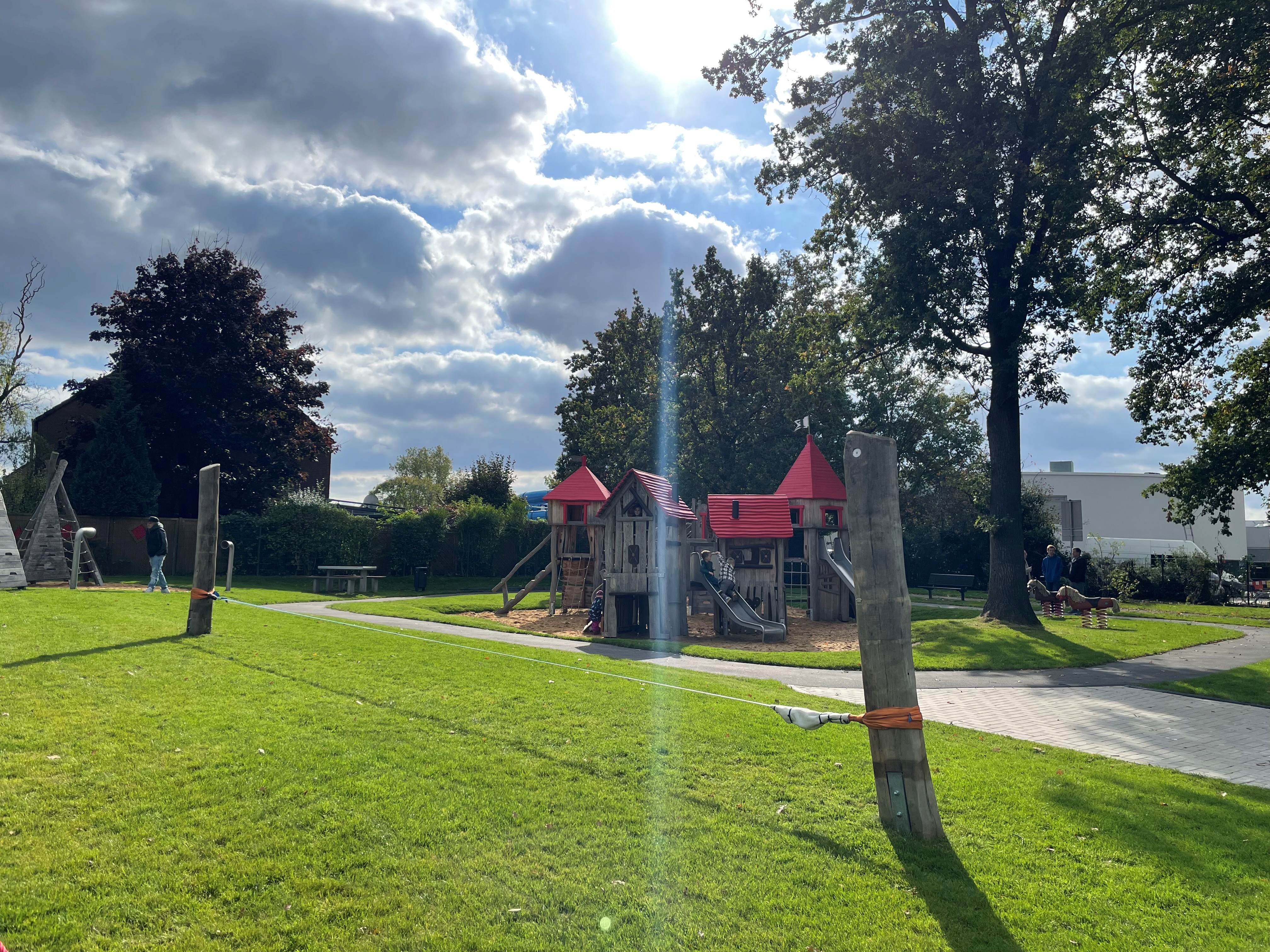 „Mit rund 1270 Quadratmetern ist dieser Spielplatz einer der größeren in Monheim“, sagt Achim Wieghardt. Und der erste, der eine Slackline und ein doppeltes Balancier-Seil aufweisen kann. Zu den Kletterhäuschen mit Rutschen, zwei hölzernen Pferdewipptieren und einer Doppelschaukel laden Bänke sowie eine Picknicktisch-Garnitur zum Päuschen mit Mama und Papa ein. Umrahmt wird die Sandfläche von einem glatten Asphaltweg – perfekt für ein Wettrennen mit Laufrad, Roller oder Bobby Car. „Wir suchen nun noch Spielplatzpaten“, sagt Achim Wieghardt. Wer Interesse habe und optimalerweise in der Nachbarschaft lebe, könne sich gerne melden. Alle Infos und ein Flyer zum Download stehen auf der städtischen Website bereit. Dort finden Interessierte auch die digitale Spielplatzkarte, auf der alle 75 Spielplätze verzeichnet sind. Unter